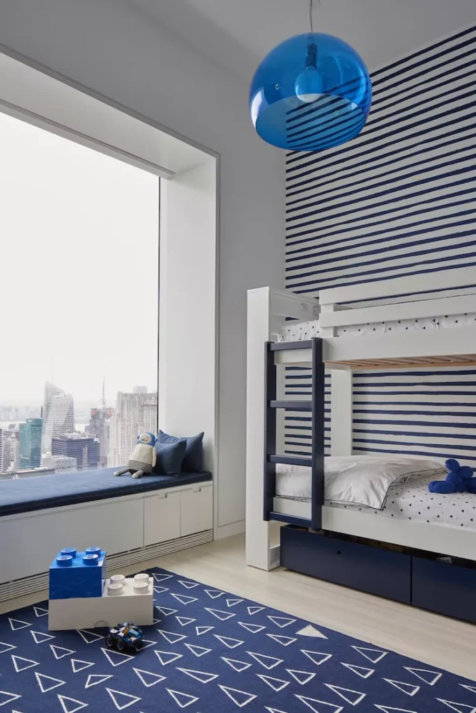 This New York City boys’ room by Sissy + Marley Interior Design features a large picture window with a built-in window seat that’s perfect for reading, daydreaming, or just watching the world go by.