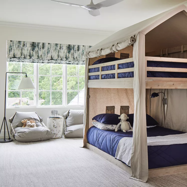 Bring the adventure of camping indoors with a playful glampsite setup. This creative room by Mel Bean Interiors includes a spacious bunk bed with a roll-up tent, comfy bean bag chairs, and a small wood stump table, making it perfect for siblings or sleepovers.