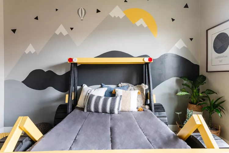 In this playful design by Etch Design Group, a mountain scene in soft shades of white, gray, black, and hints of yellow pairs beautifully with a ski lift-shaped bed frame, turning the space into a mini adventure zone.