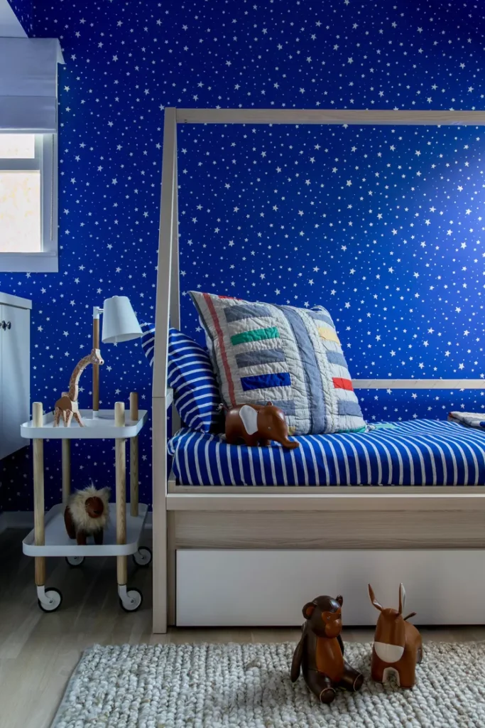 Decorate the walls with a starry sky wallpaper to create a dreamy atmosphere. Pale wood tones on the furniture and floors help keep the space light while still feeling cozy and calm for bedtime.