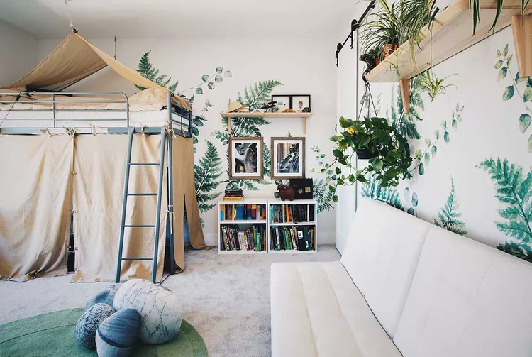 Hang leafy wallpaper to bring a touch of nature inside. Add a tall bed fort covered with a khaki tent where kids can hide out, play, sleep, and let their imagination run wild.