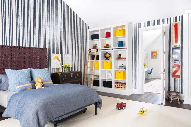In this setup, the tall built-ins with a sliding ladder, black and white striped wallpaper, and practical storage create a stylish yet functional look.