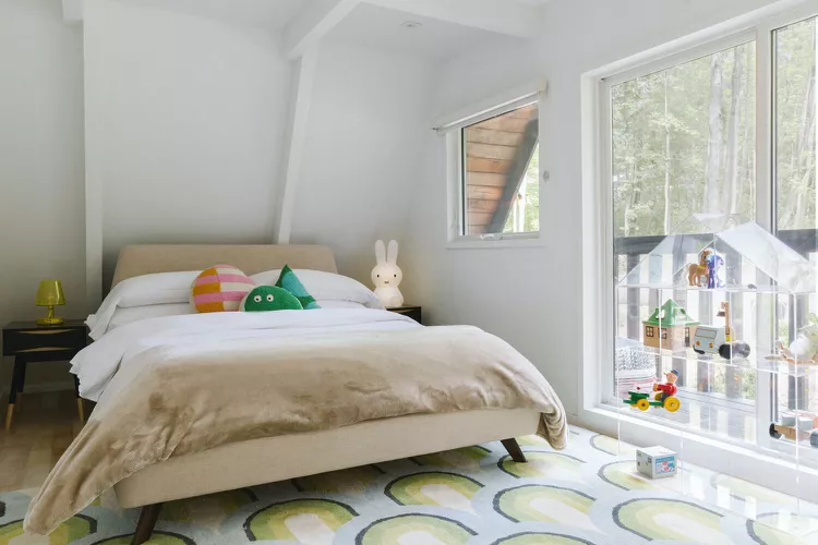 Keep a minimalist boys’ room feeling fun with a few whimsical details. A glowing bunny bedside lamp, colorful throw pillows, a rainbow rug, and an acrylic dollhouse add charm to this 1960s A-frame bedroom without cluttering the space.