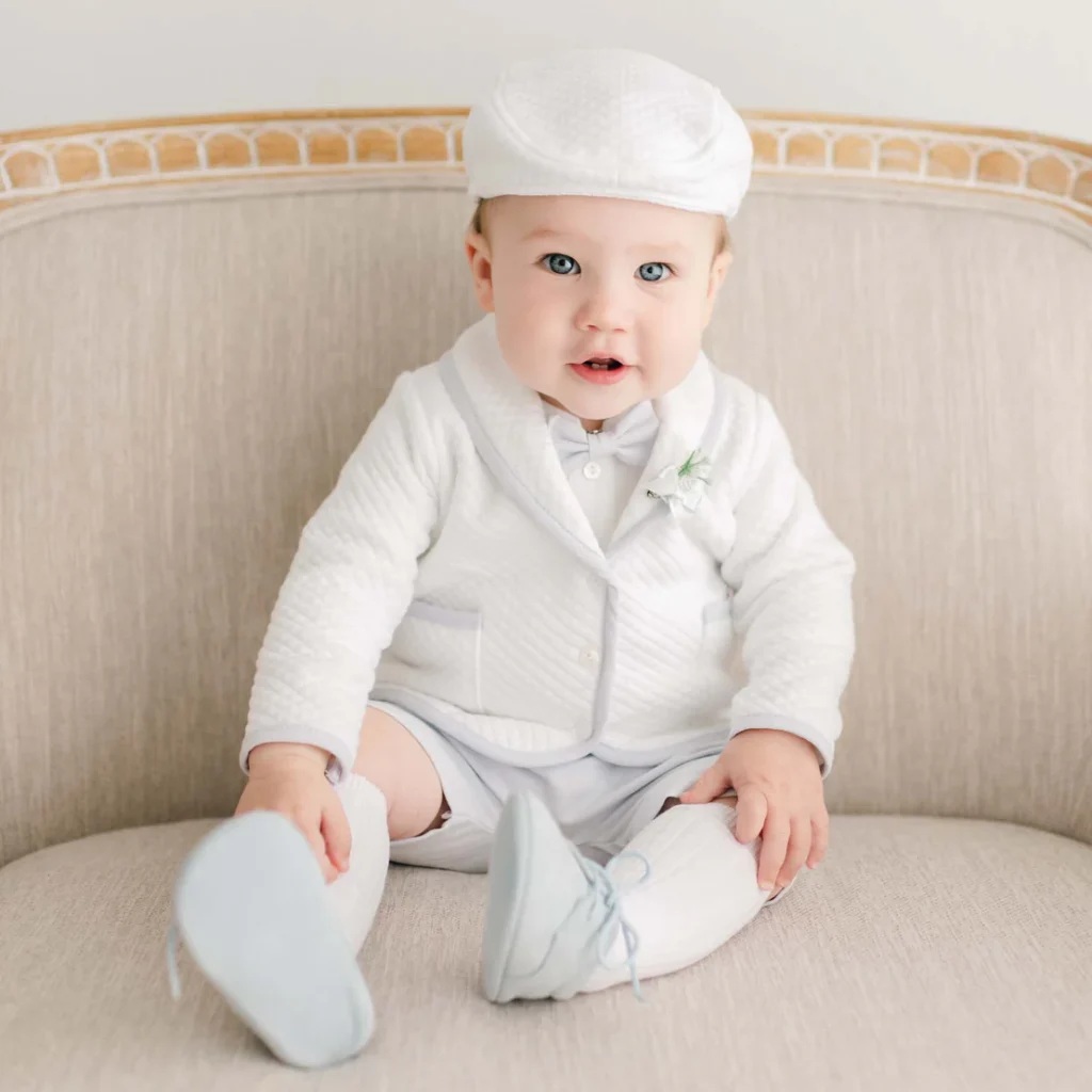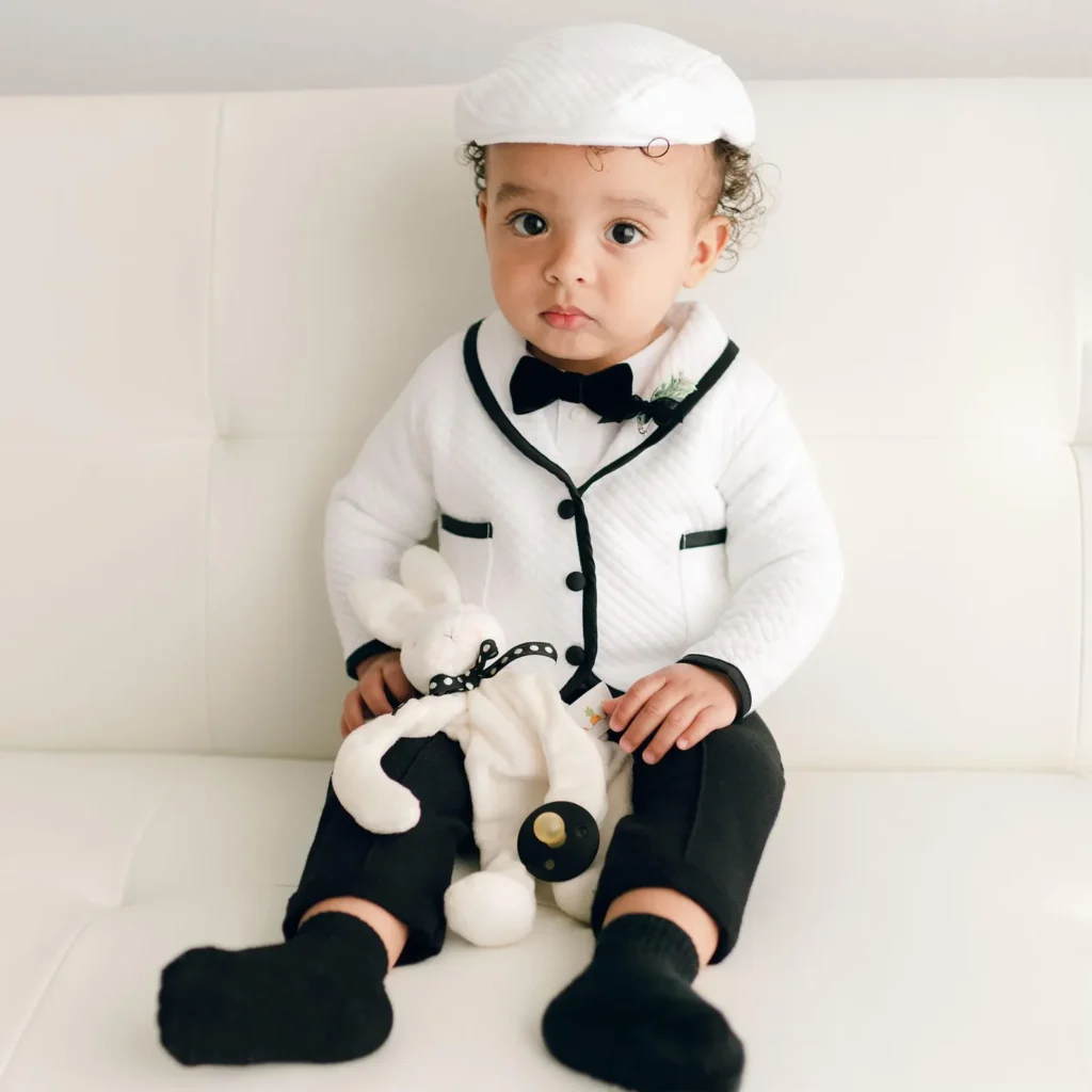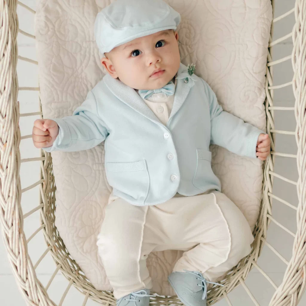 For a gentle and airy look, this pastel blue suit is perfect. The matching cap and bow tie make it look extra sweet while keeping the baby cozy. The soft fabric allows easy movement, making it ideal for babies attending their first big event. It’s light, cute, and picture-ready.