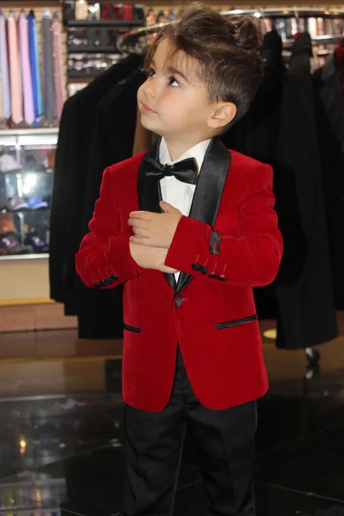 This red velvet blazer stands out and brings a fun pop of color to any wedding. The black lapel and matching bow tie give it a sleek, elegant finish. It’s perfect for evening receptions or festive events where a bit of sparkle is welcome. The look balances boldness and cuteness in the best way.