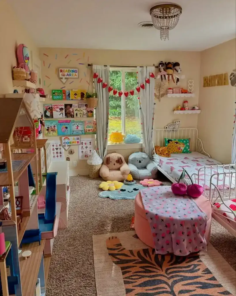 This sweet and colorful space by Ashley Guy feels like a storybook come to life. From the sprinkle wall decals to the rows of empowering reads like Ambitious Girl and I Am Brave, every detail invites curiosity and comfort.