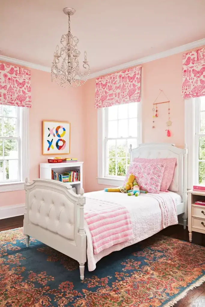 A soft pink wall color is a timeless and versatile backdrop that grows beautifully with your child. This gentle hue allows classic elements like ornate rugs and tufted bed frames to stay stylish as she matures.