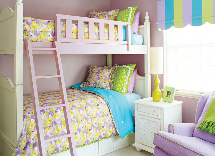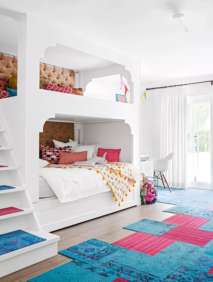 For shared bedrooms or fun sleepover setups, choose an elegant bunk bed with curved details to avoid a bulky look. Add pops of color and comfort with carpet tiles that are easy to maintain and practical for playtime or crafts.