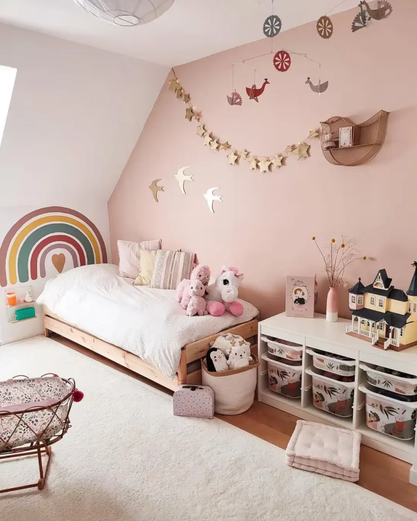 This sweet pink toddler room feels like a fairytale come true. The walls are painted in soft shades of blush and rose, creating a cheerful yet calming vibe.