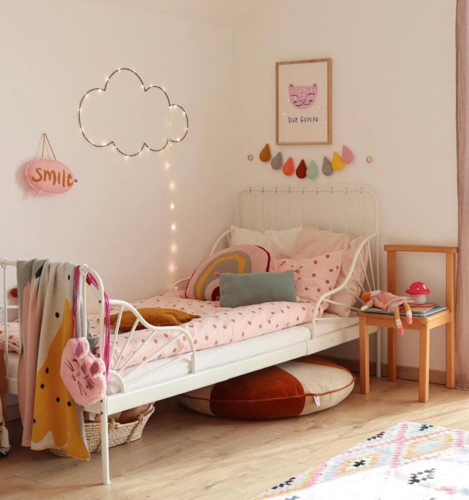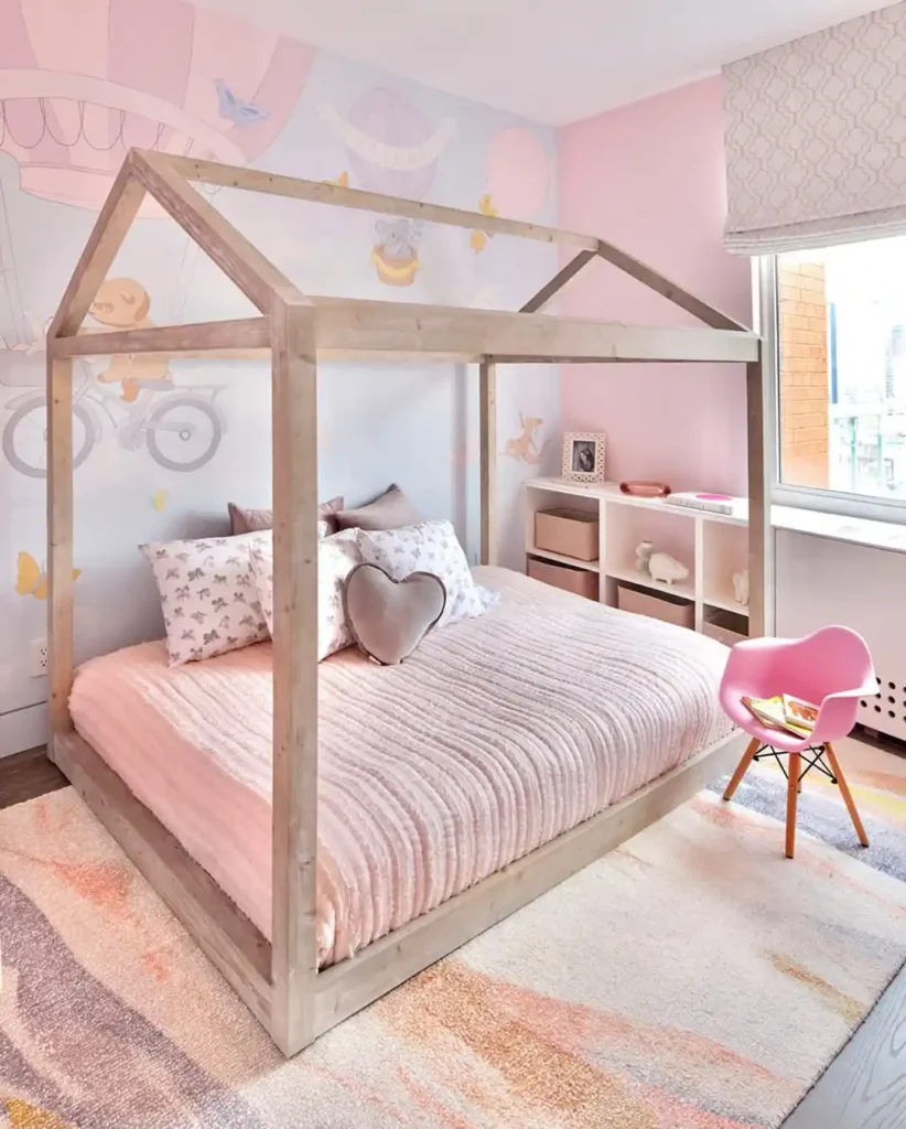 A house-frame bed always adds a touch of magic, giving a child their very own little world. This setup keeps things simple yet dreamy with blush bedding, a velvet heart pillow, and a soft mural in the background.