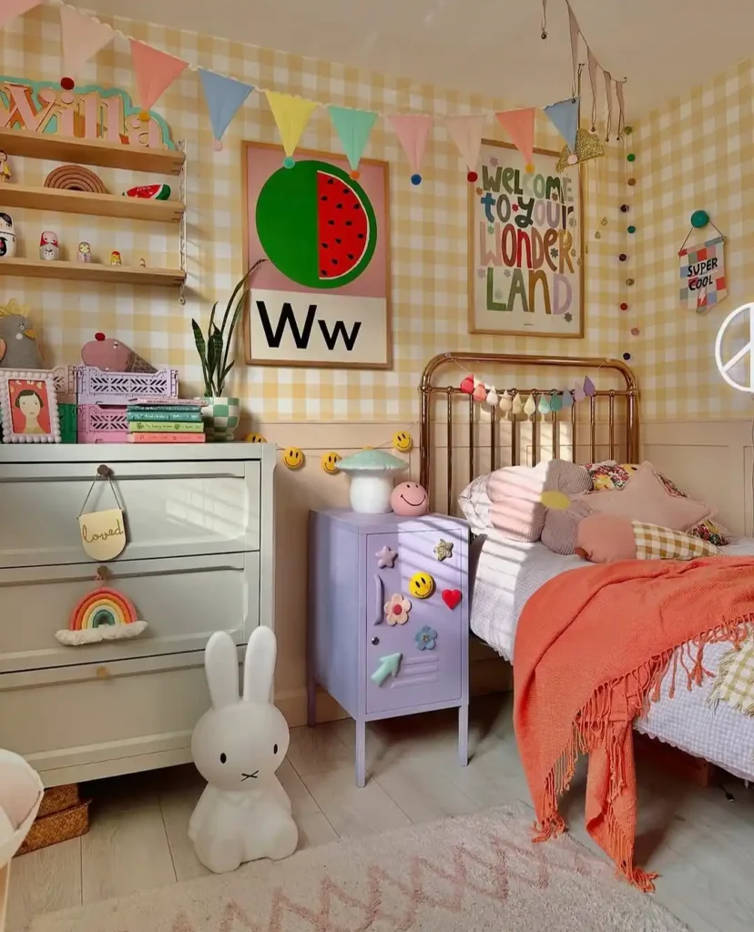 Not every toddler room has to be soft and subtle. This design celebrates color and personality in the most joyful way possible. Rainbow bunting, gingham wallpaper, a mushroom lamp, and even a watermelon print come together effortlessly.