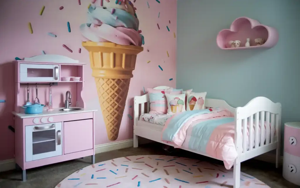 This space feels like stepping into a pastel gelato dream, yet it still manages to be perfectly livable. The oversized ice cream cone mural is bold but sweet, and the sprinkle rug below adds that instant smile factor for both kids and adults.