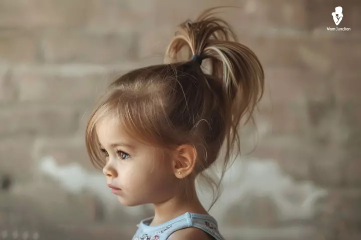 This style suits shorter or curly hair beautifully. Brush your toddler’s hair up toward the top of her head and gather it into a small pigtail. Use a fun ribbon or elastic to secure it and let a few soft strands fall naturally around her face.