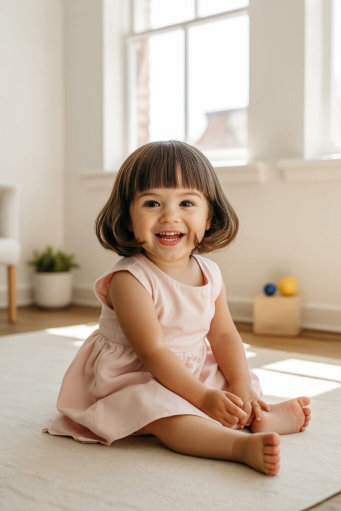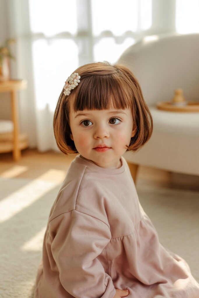The classic bob is a timeless style that works beautifully for toddlers. It keeps the hair short enough to manage while letting the bangs frame the face in a cute way.