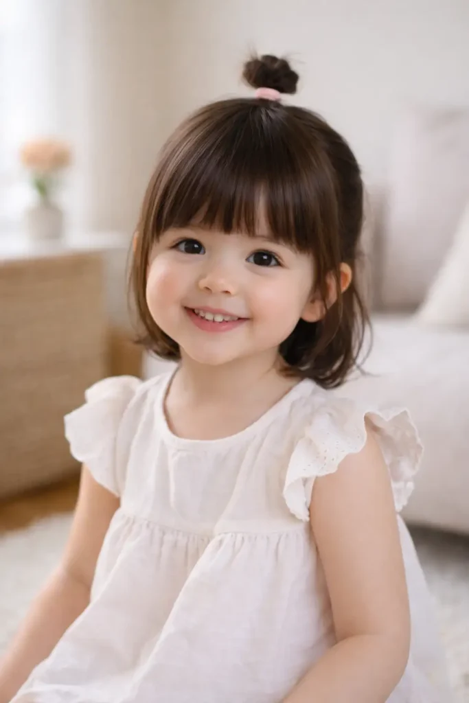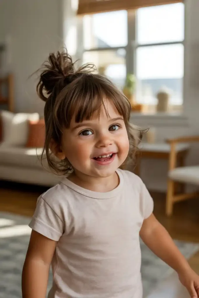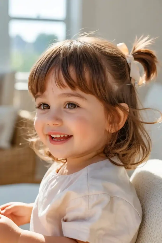 A side bun with a ribbon adds a sweet finish to your toddler’s everyday look. Pull the hair into a small side bun and tie it with a colorful ribbon or bow. Keep the bangs as they are to frame the face gently.