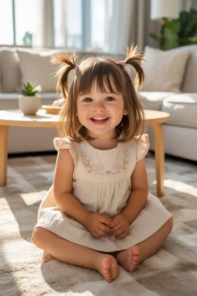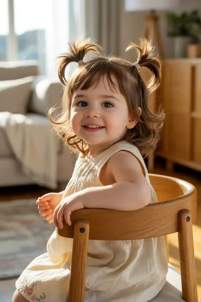 Double buns are both cute and practical for toddlers. Part the hair down the middle and twist each side into a small bun. The bangs stay soft and natural at the front, giving a fun and balanced look.