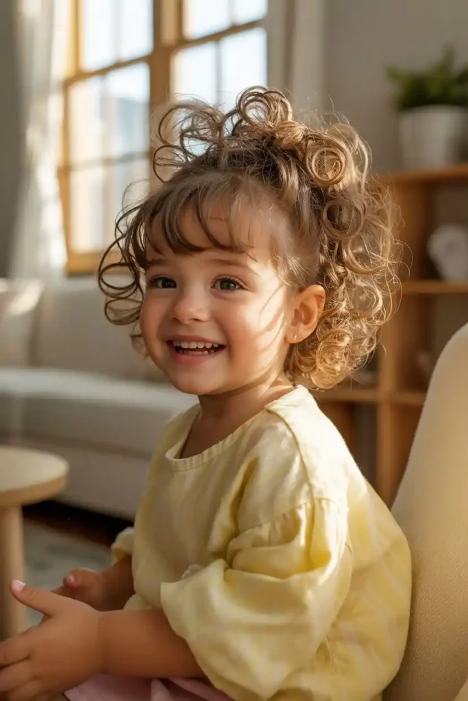 If your toddler has naturally curly hair, a curly puff with bangs is a great way to show it off. Gather the hair into a high puff while letting the curls at the front stay loose.