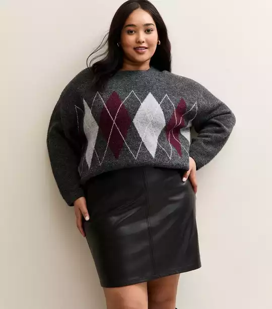 This look is perfect for chilly days when you want warmth with a bit of edge. The dark argyle sweater adds a soft and relaxed feel, while the leather skirt brings a bold touch that balances the outfit beautifully. Pair it with black tights and ankle boots for a stylish winter-ready vibe that feels effortless yet put together.