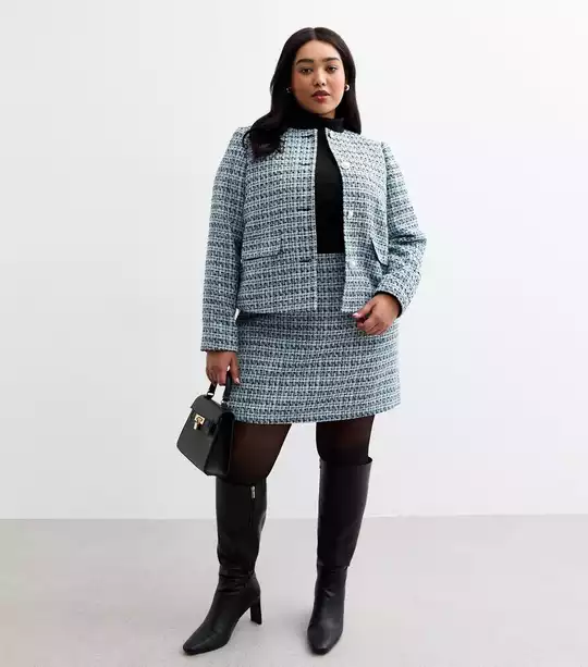 Nothing says winter chic like a classic tweed mini skirt paired with a matching jacket. The soft texture and light blue tones bring sophistication, while the black top and boots tie everything together. It’s the perfect outfit for workdays, events, or any moment when you want to feel both warm and stylish.