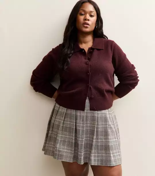 Classic Plaid Skirt with Deep Burgundy Cardigan