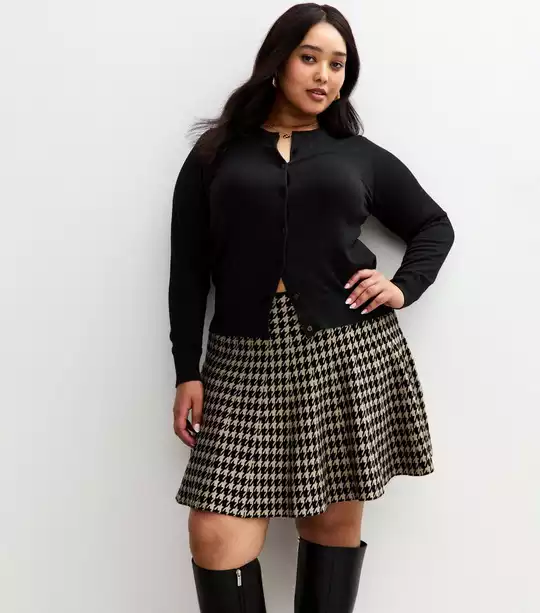 The black cardigan paired with a houndstooth skirt creates a chic and balanced outfit that flatters every shape. The bold pattern of the skirt adds personality, while the solid top keeps things sleek and simple. With knee-high boots and tights, this look easily becomes a winter favorite.