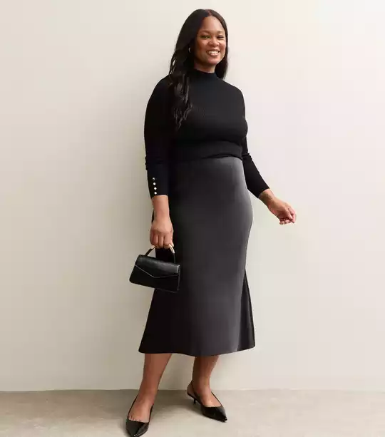 This outfit is a perfect mix of simplicity and grace. The charcoal midi skirt flows softly while the fitted black top keeps the shape clean and flattering. Add pointed flats or ankle boots for an easy, polished look that works for any day of the week.