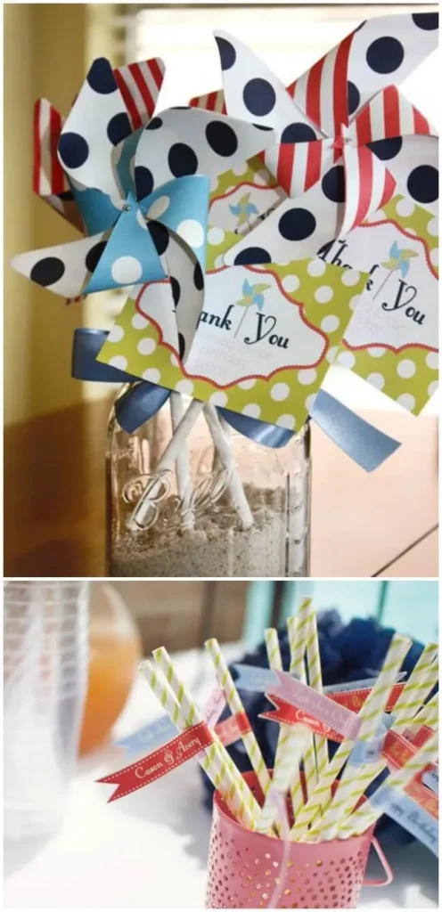 Add a cheerful and playful touch to your twins’ celebration with a bright pinwheel party theme. Colorful paper pinwheels in polka dots and stripes bring instant joy to the table and can also double as thank-you favors.