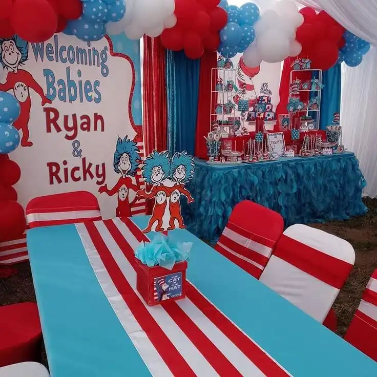 Turn your twins’ birthday into a fun-filled Dr. Seuss celebration with a “Thing 1 and Thing 2” theme. Bright red and blue decor instantly bring this playful world to life.