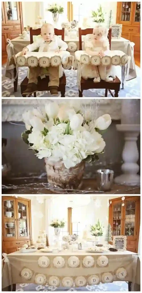 Turn your twins’ birthday into a dreamy winter wonderland filled with soft white and silver tones. Decorate the space with snowflake accents, white tulips, and rustic textures that bring a cozy yet elegant feel to the celebration.