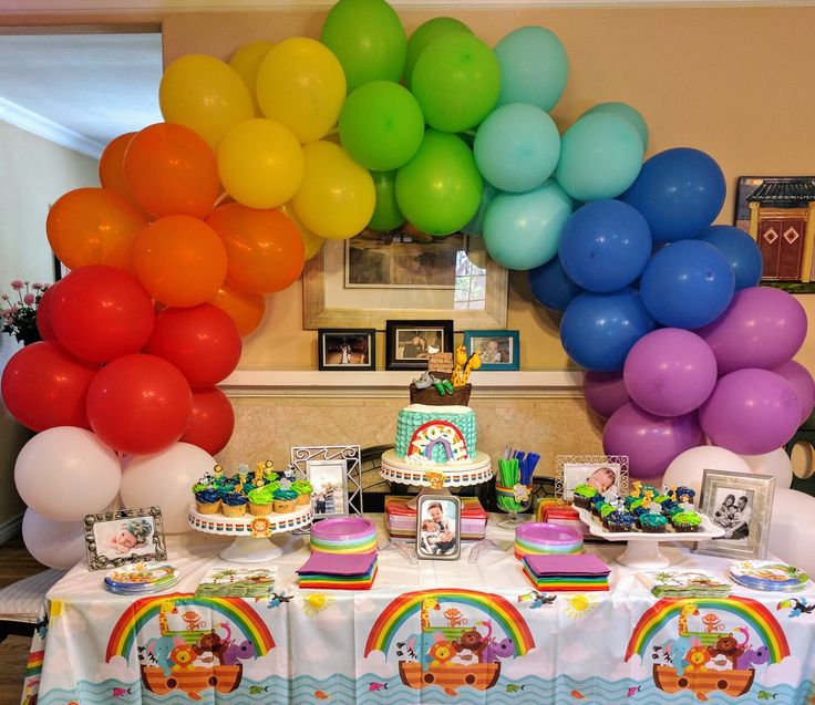 Think rainbow balloon arches, animal cupcakes, and a cake decorated with pairs of creatures. You can include small framed baby photos, rainbow plates, and bright table covers to make everything feel warm and happy.