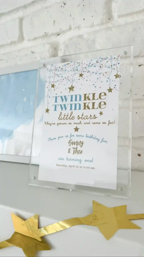 Set the tone for the party with a star-themed invitation that shimmers with gold and blue details. A simple message like “Twinkle Twinkle Little Stars,