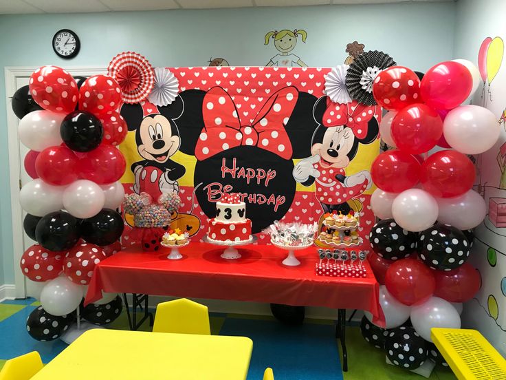 Decorate the space with red, black, and white balloons, polka dots, and lots of cheerful details. Set up a dessert table with cupcakes, cookies, and a cake featuring both characters.