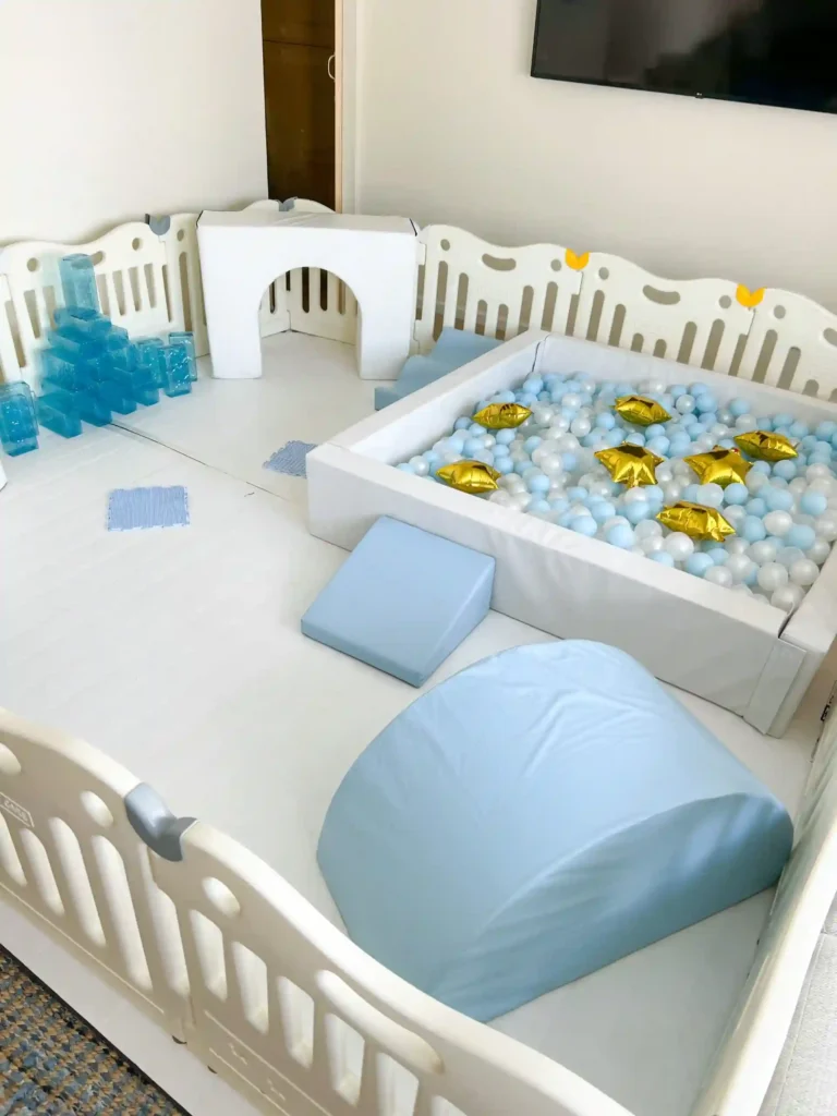Create a soft play space where your twins can explore safely. Add light blue tones, gold star-shaped balls, and cozy play mats for a fun and gentle setup.