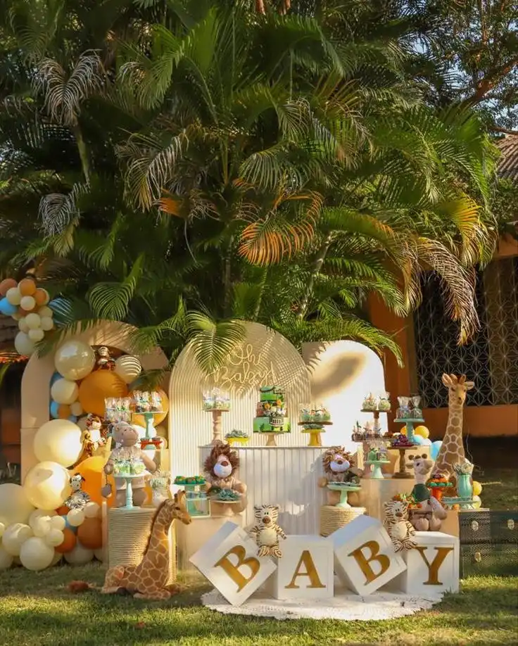 Use natural greens and browns, balloon arches, and animal figures like lions, giraffes, and elephants. Serve themed cupcakes and snacks inspired by the jungle.