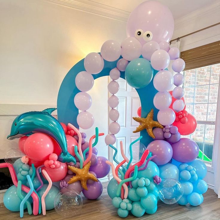 Balloon arches shaped like ocean waves make a wonderful backdrop for photos. Add under-the-sea cupcakes, coral-inspired decorations, and ocean-themed tableware.