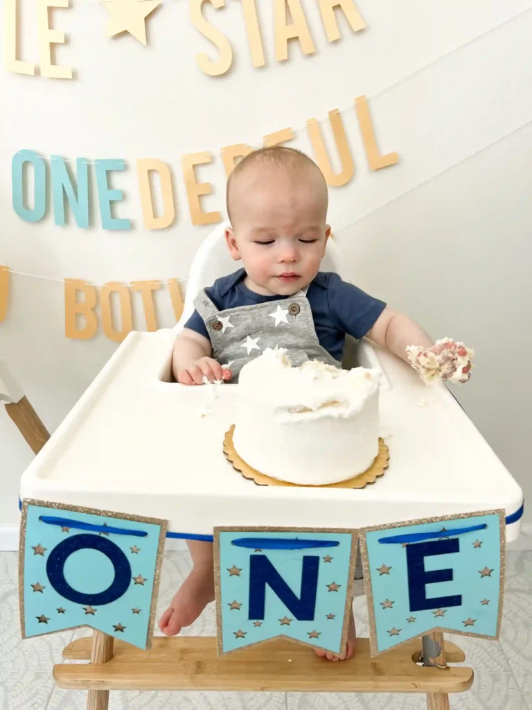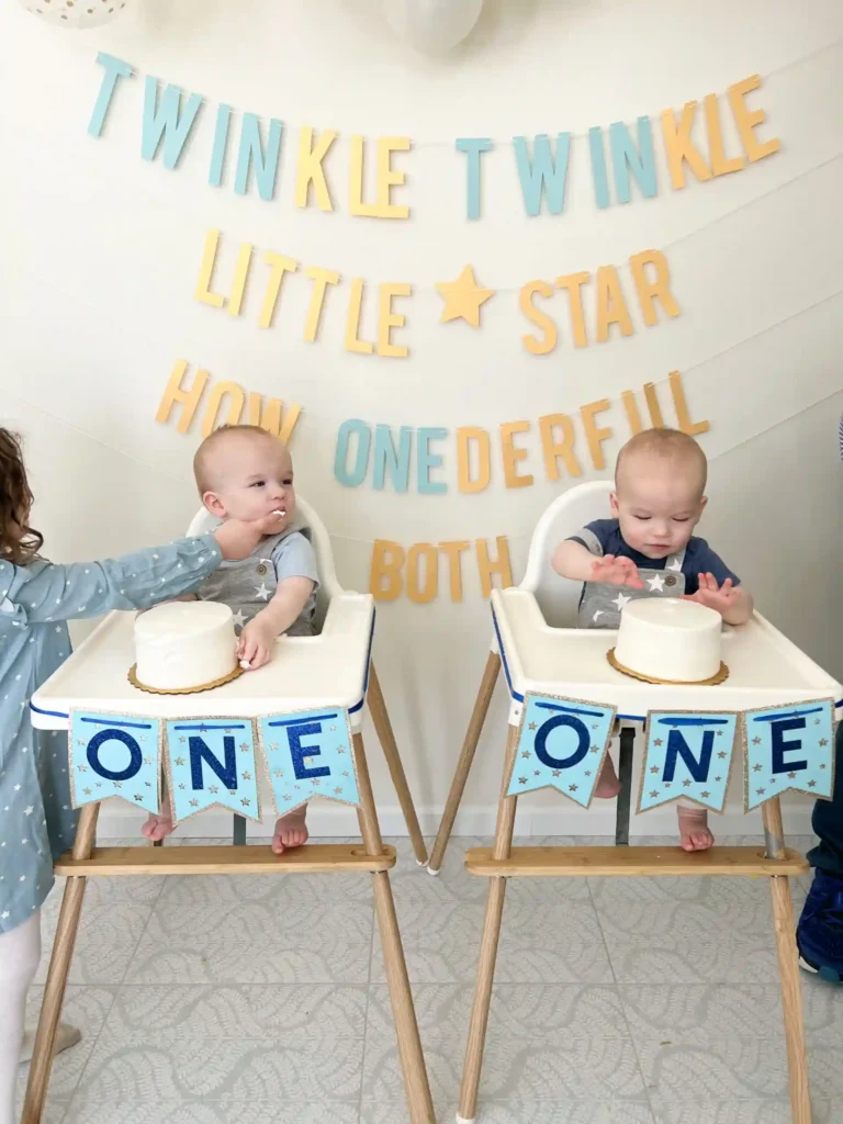 Finish the celebration with a sweet twin smash cake moment. Decorate each high chair with matching blue “One” banners and place mini cakes for your twins to enjoy.