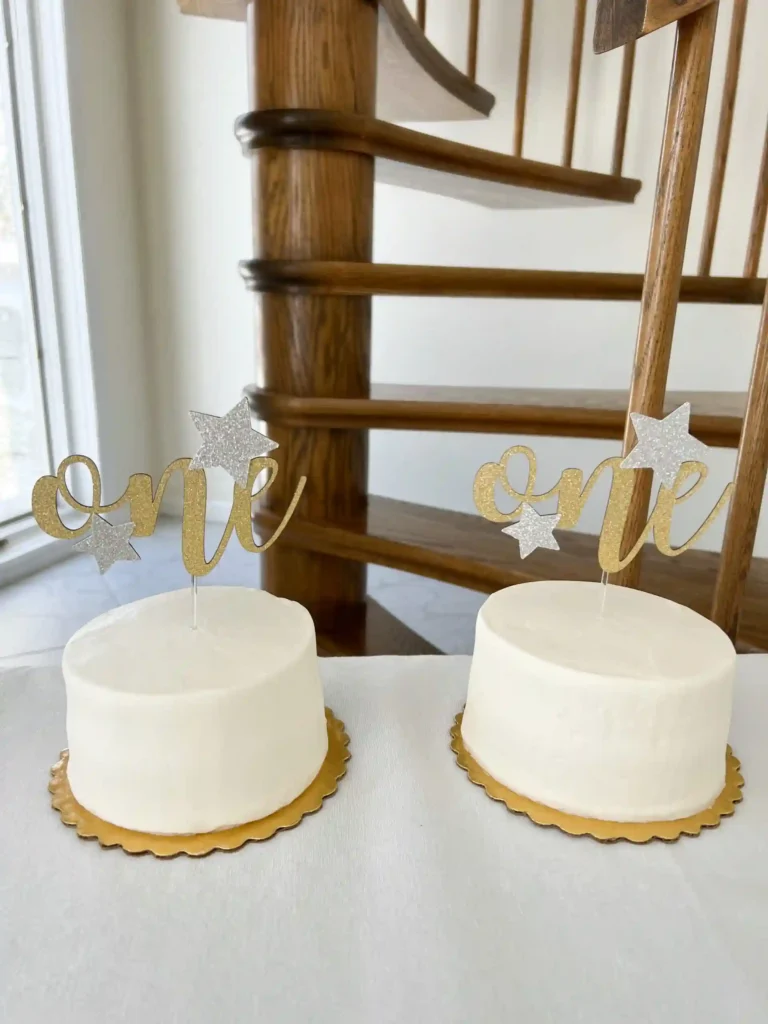 These twin smash cakes are the perfect finishing touch for your “Twinkle Twinkle Little Star” celebration. Simple white frosting with golden bases and sparkling toppers that say “One” keeps the look classic and elegant.