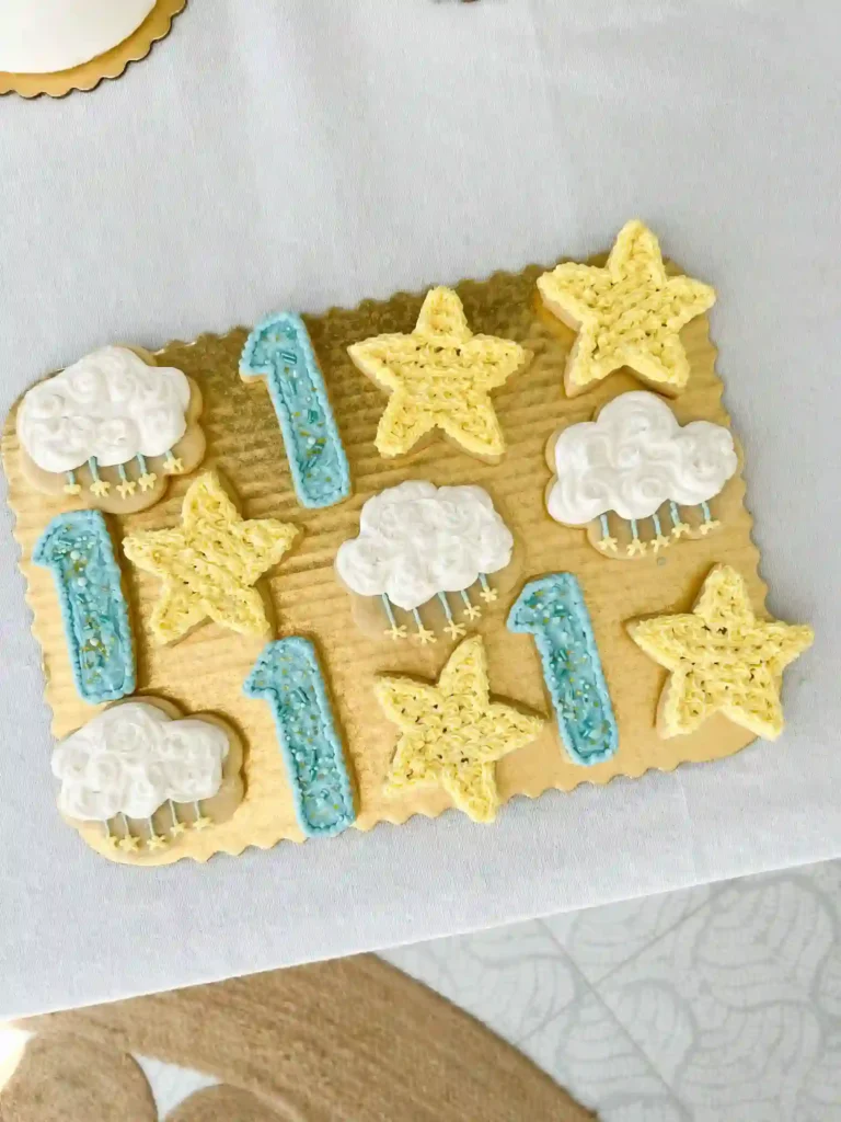 Add extra charm to your dessert table with cookies shaped like stars, clouds, and number ones. The soft blue and golden yellow icing ties in beautifully with the party theme, bringing the whole setup together.