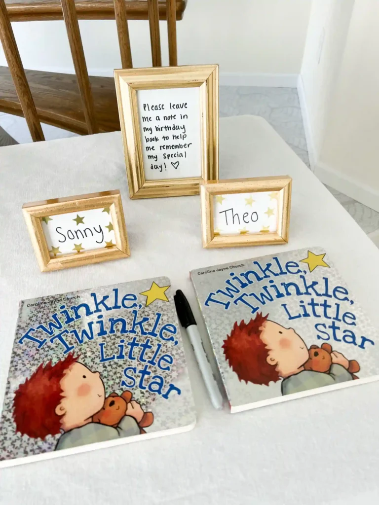 Set up a charming guest book table to collect sweet wishes for your twins. Use copies of “Twinkle Twinkle Little Star” as memory books where family and friends can leave notes.