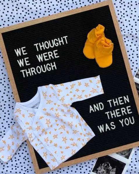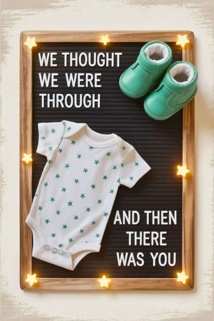 This sweet setup says it all. A tiny star-patterned onesie, little booties, and a letter board with the words “We thought we were through and then there was you.”