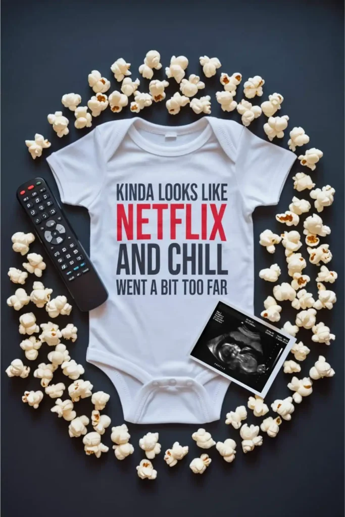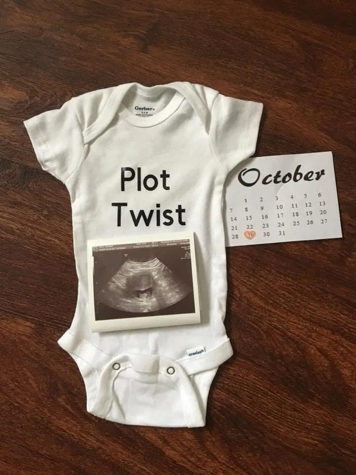 Sometimes all you need is a baby onesie and a few simple props to make a statement. This minimalist setup with “Plot Twist” written across the front says it all.