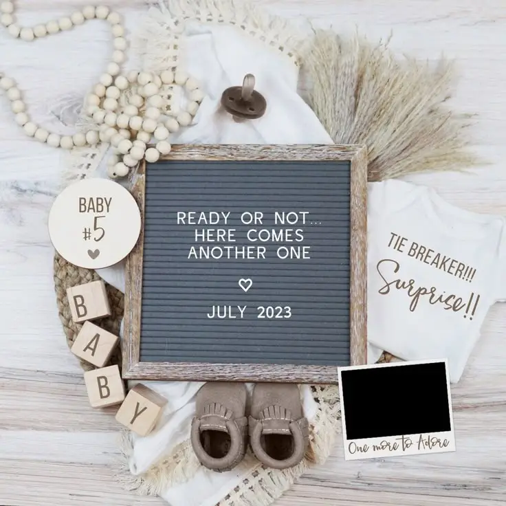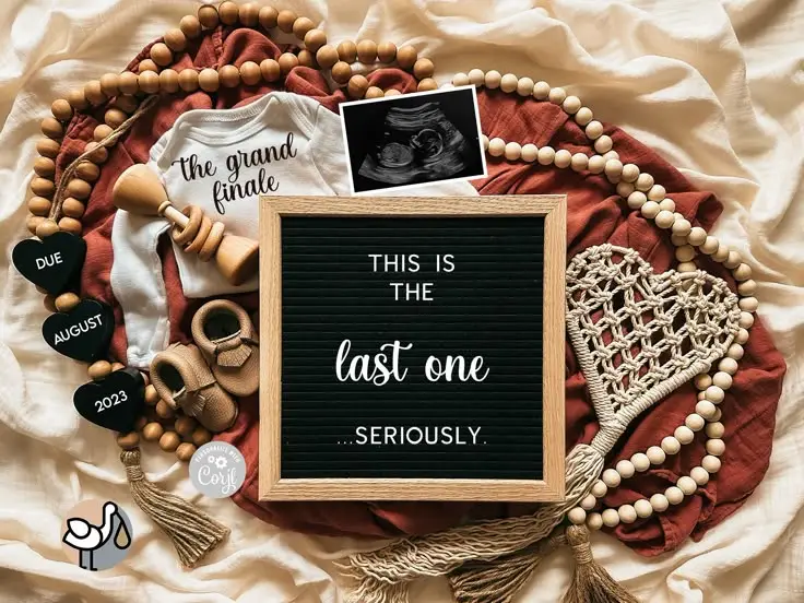For parents welcoming one more little one, this idea says it all. Surrounded by neutral baby pieces and warm tones, the message “This is the last one, seriously” feels relatable and lighthearted.