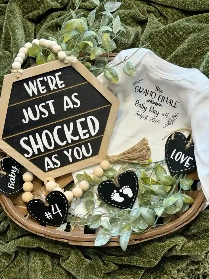The sign reads, “We’re just as shocked as you,” sitting next to a sweet onesie that says “The Grand Finale, Baby #4, August 2024.” Surrounded by greenery, wooden beads, and baby-themed charms, it’s a beautiful balance of humor and joy.