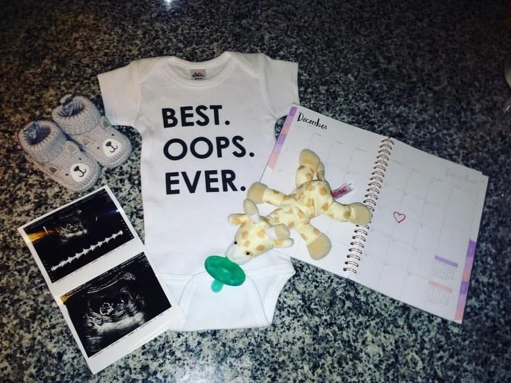 This flatlay brings a mix of sweetness and humor to your big reveal. The onesie printed with “Best. Oops. Ever.” sits beside baby booties, ultrasound photos, a planner, and a tiny giraffe toy.