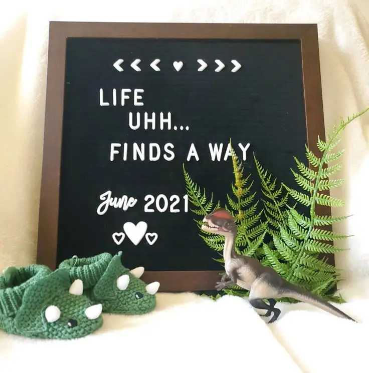 Inspired by the famous line from Jurassic Park, this playful idea adds a bit of humor to your big reveal. The little green dinosaur booties and leafy backdrop make it fun and memorable.