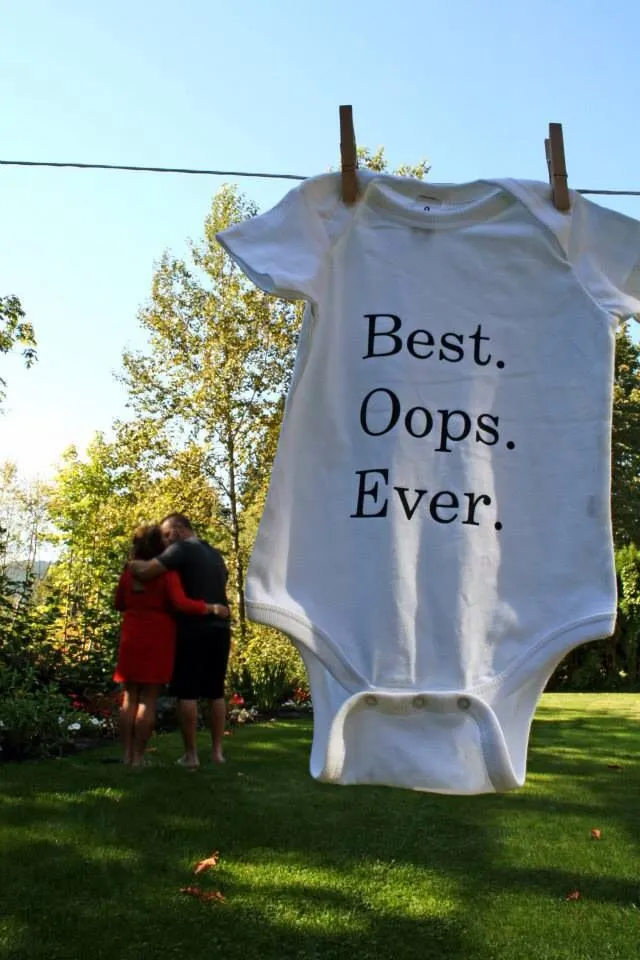 Wear matching shirts that say “Oops” for you and “We did it again” for your partner. It’s a lighthearted way to share your unexpected news.