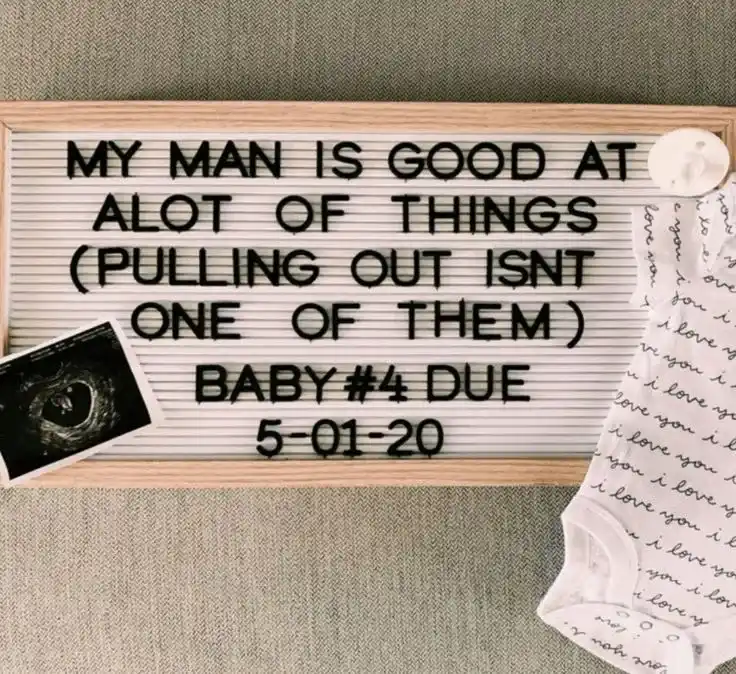 This one brings the humor front and center. The board reads, “My man is good at a lot of things (pulling out isn’t one of them)” with a sweet onesie and ultrasound photo beside it.