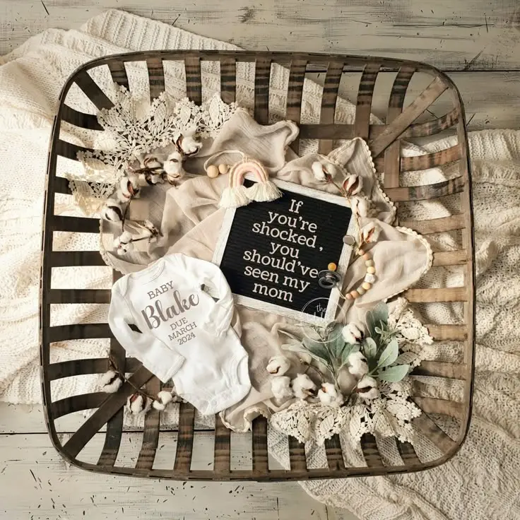 For families who enjoy a playful twist, this adorable setup nails it. A soft basket filled with cozy textures, tiny baby items, and a letter board that says, “If you’re shocked, you should’ve seen my mom.”