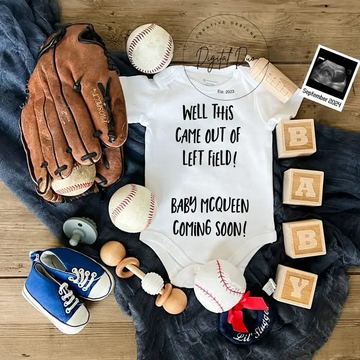 This baseball-inspired announcement is a home run for sports-loving families. The onesie says, “Well this came out of left field! Baby McQueen coming soon!” surrounded by tiny sneakers, baseballs, and a glove.