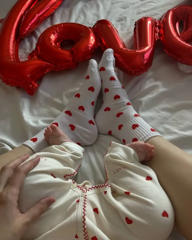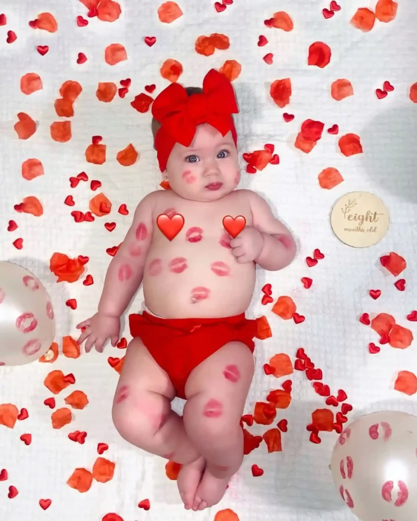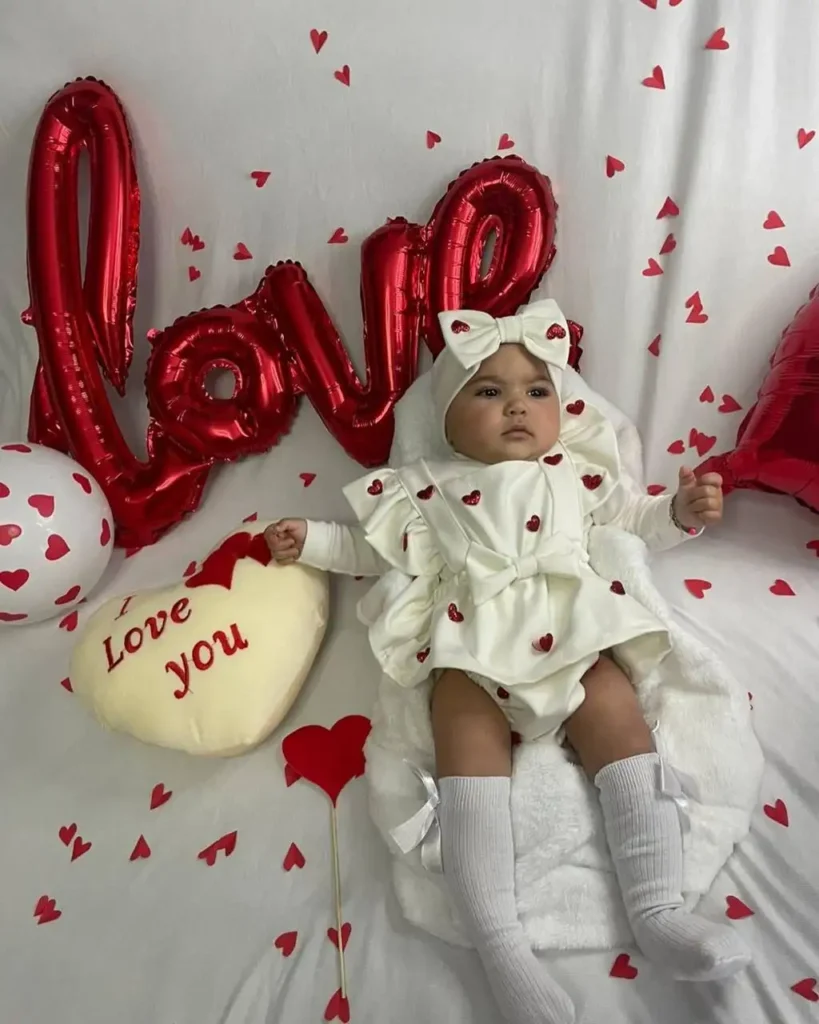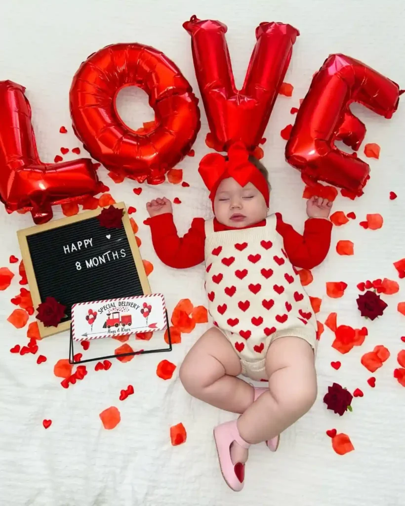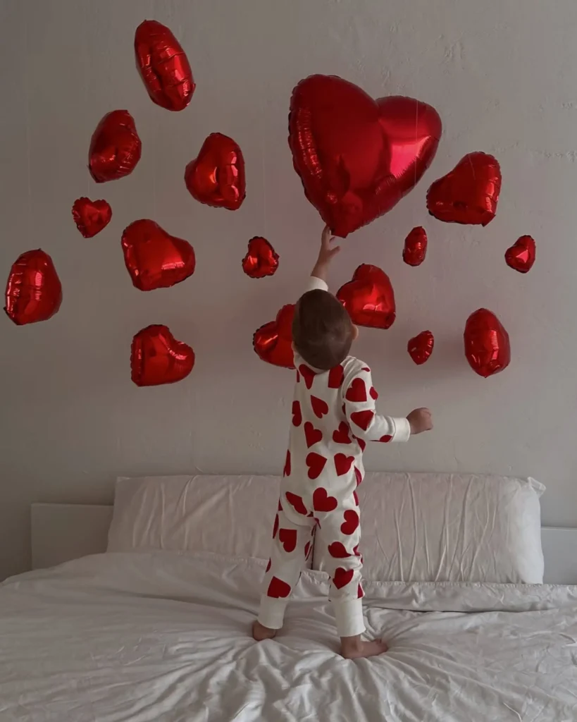 Simple props such as heart garlands, red balloons, or paper cutouts can make a big difference. When it comes to outfits, soft pinks, reds, or cozy neutrals keep the Valentine’s theme without feeling overdone.